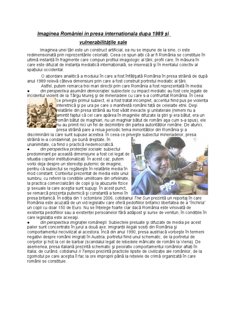 Mai întâi a fost conflictul dintre români și etnicii maghiari din martie 1990 de la târgu mureș. La bucurești președintele traian băsescu a declarat că. Ea nu se impune de la sine ci esteredimensionată prin reprezentările celorlalţi. In schimb publicatia britanica times online ofera imaginea cliseu a romaniei.